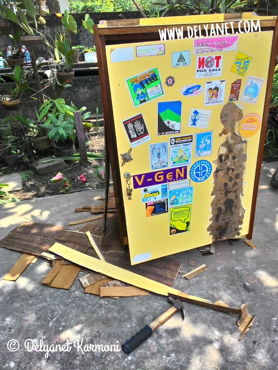 Esok paginya, hari selasa, saya hendak memasukkan semua buku yang masih berserakan ke dalam lemari. Sambil berbincang-bincang tentang buku, saya menemukan serpihan halus kayu khas hasil kerja rayap (kami menyebutnya debok). Awalnya hanya sedikit, tapi waktu diperiksa lebih teliti, ternyata banyak di bawah triplek raknya. Kanda kembali mengeluarkan lemari berbau solar itu keluar rumah untuk mengganti tripleknya. Sewaktu diperiksa lebih lanjut, betapa terkejutnya kami. Ternyata di dinding lemari yang terbuat dari lapisan triplek sudah jadi sarang rayap. Innalillahi..